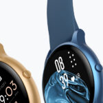 Three smartwatches displaying digital time faces in rose gold, blue, and black color variants with curved displays and silicone bands.